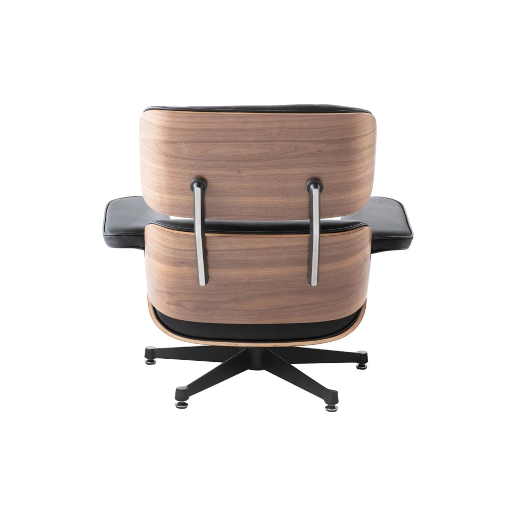 The NH301 Eames Lounge Chair Replica features black Italian aniline leather upholstery paired with walnut wood veneer, finished with the distinctive Elephant Base, offering a bold yet timeless presence. This refined combination makes it an ideal statement piece for luxury living rooms, executive offices, and contemporary interiors.
