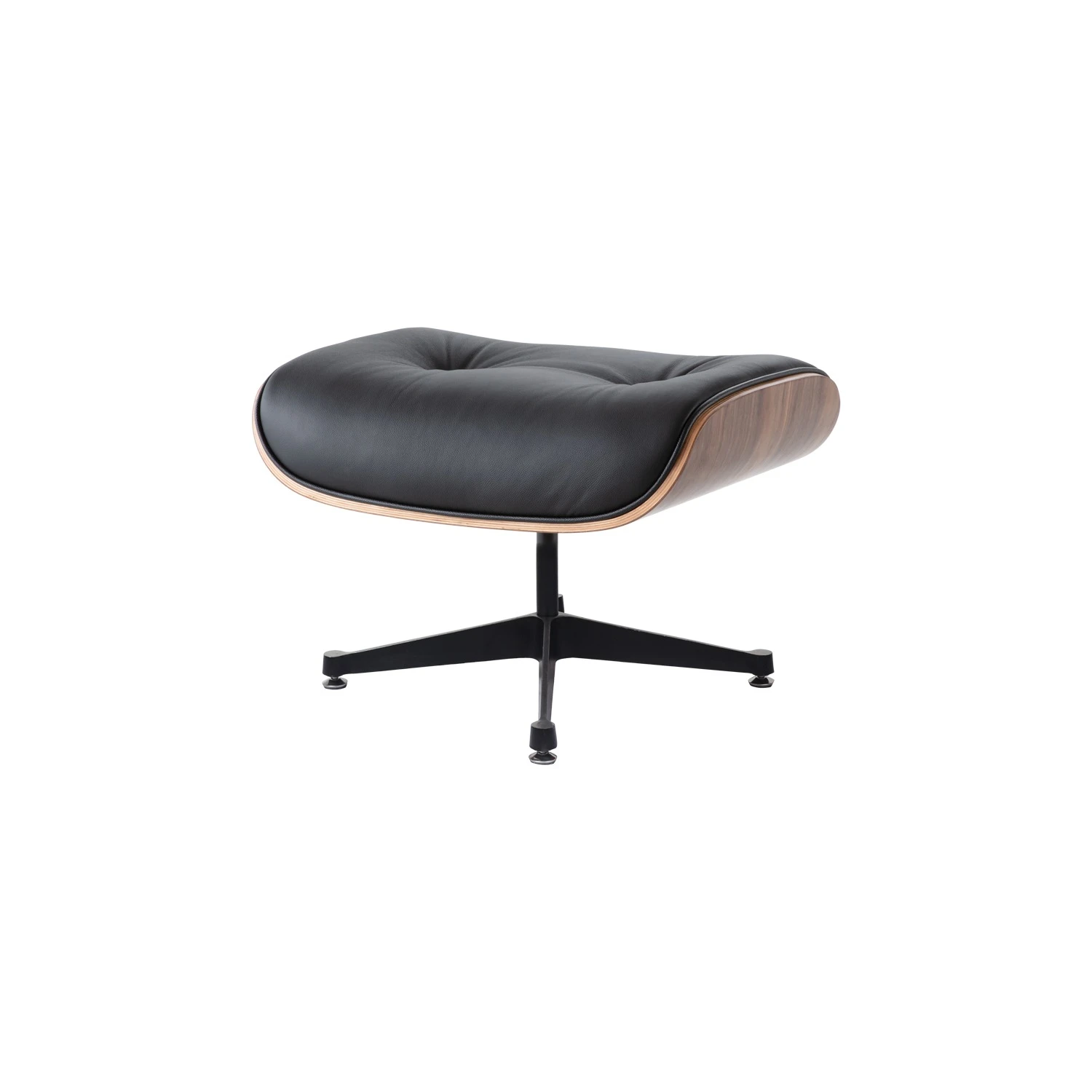 Shock-mounted construction allows the cushion to respond subtly to weight and movement, creating a floating effect that enhances the reclining experience. The ottoman’s proportions are carefully calibrated to pair seamlessly with the Eames Lounge Chair, offering an elevated footrest that completes the signature posture of mid-century leisure. The walnut veneer provides classic warmth with natural grain variation, while the black leather upholstery offers timeless sophistication.