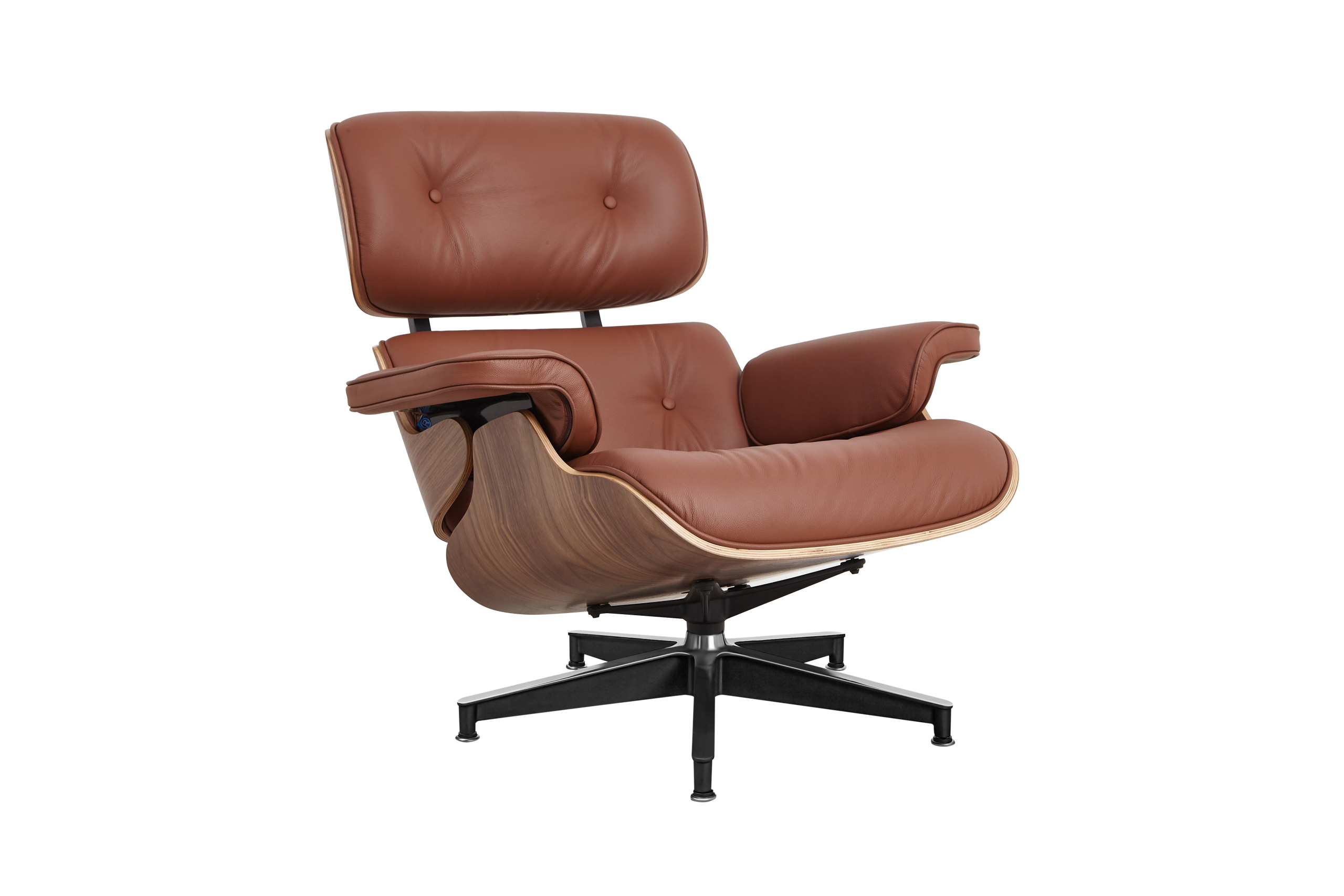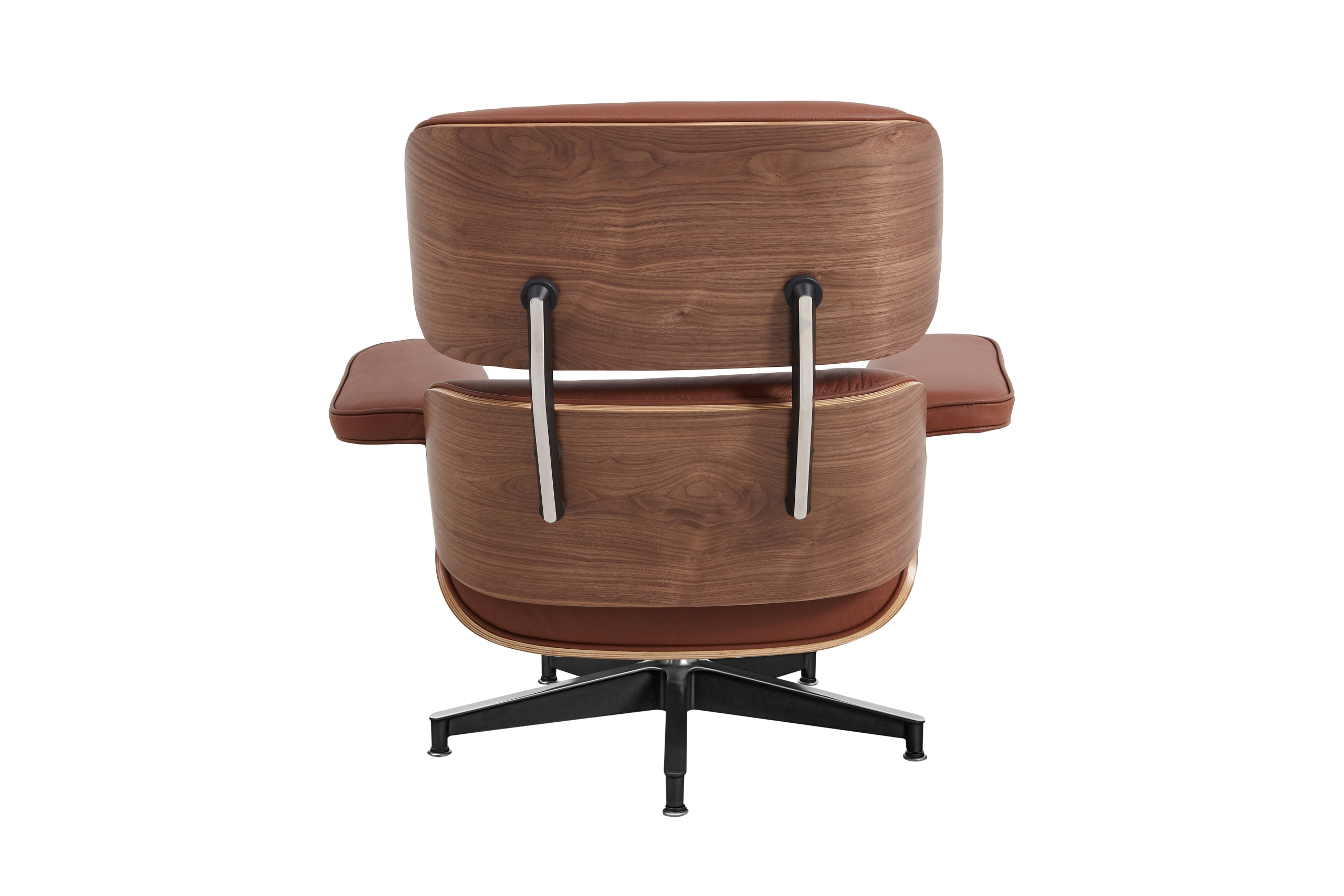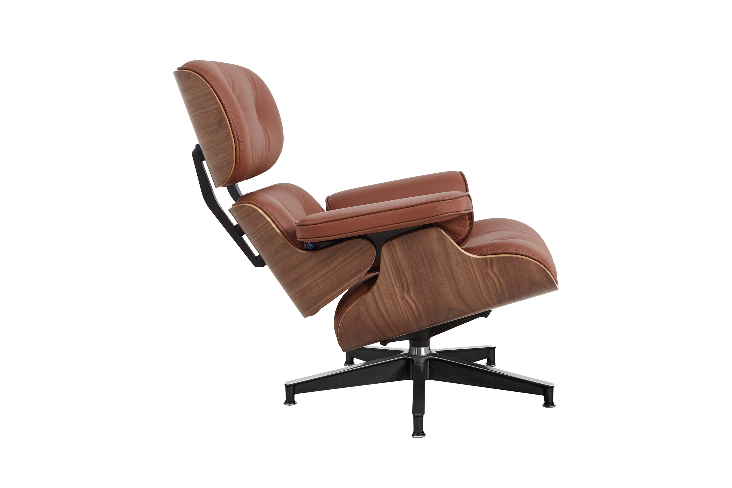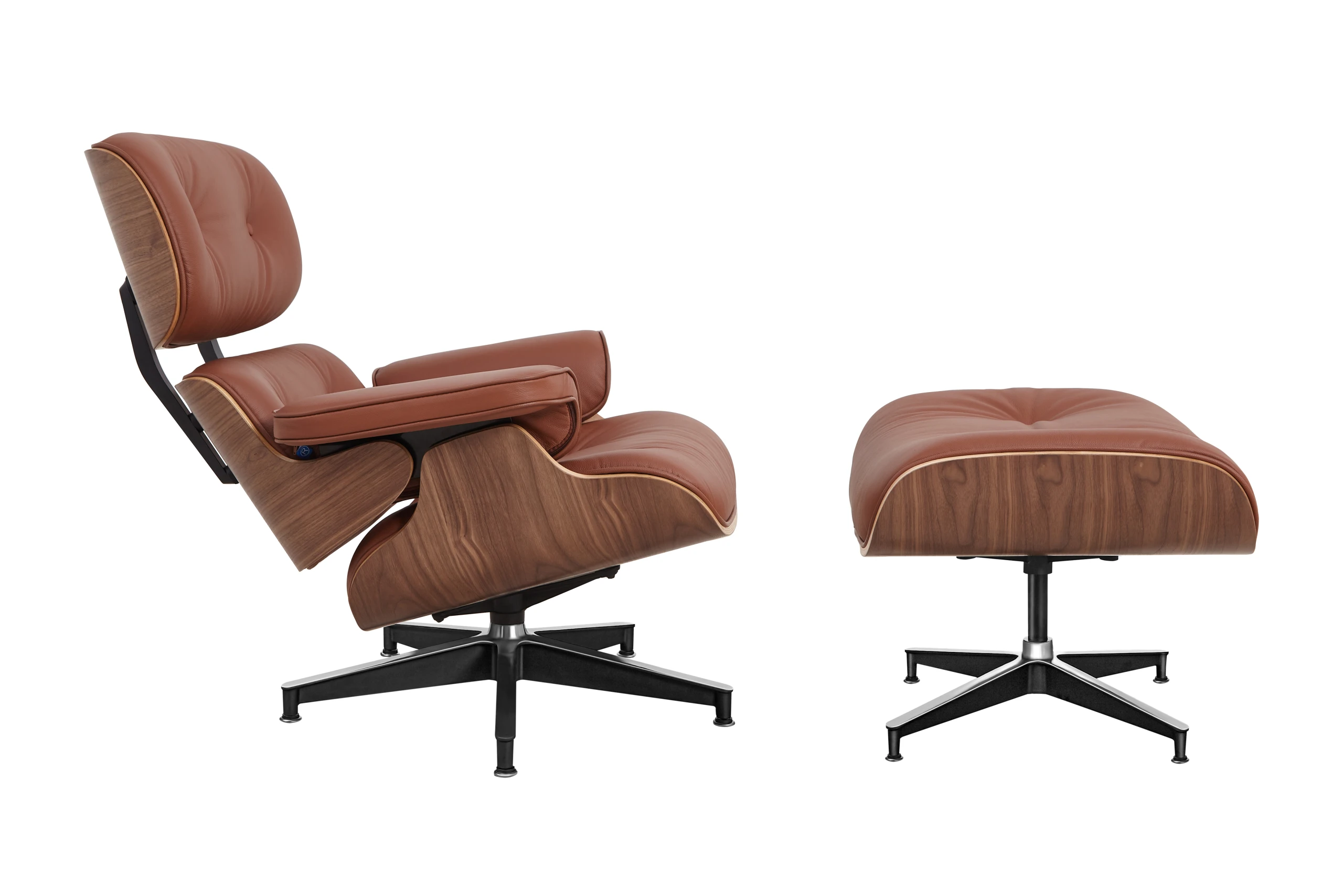 Each of the three cushions is hand-sewn with welted piping and filled with high-density fire-retardant foam, then upholstered in premium tan brown Italian aniline leather. The walnut veneer provides classic mid-century warmth with natural grain variation, while the tan brown leather offers a timeless finish that develops character and patina over time. The five-star chrome aluminum base provides stability and 360-degree swivel functionality, while the ottoman’s four-star base complements the chair’s proportions perfectly.