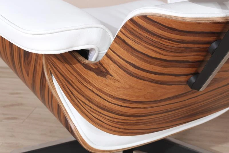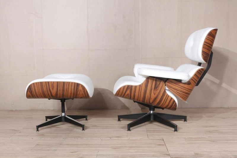 The Eames Lounge Chair and Ottoman, designed by Charles and Ray Eames in 1956, stands as one of the most influential furniture designs of the 20th century. This striking rosewood edition with white leather represents a sophisticated departure from traditional colorways—pairing the warm, dramatic grain of rosewood veneer with the clean, contemporary elegance of white Italian leather. The result is a chair that honors the original design while offering a fresh, refined aesthetic suited to modern interiors. With its ergonomic 15-degree tilt angle and shock-mounted construction, this replica delivers the same legendary comfort that has made the Eames Lounge Chair a fixture in luxury residences, executive offices, and media productions for nearly seven decades.