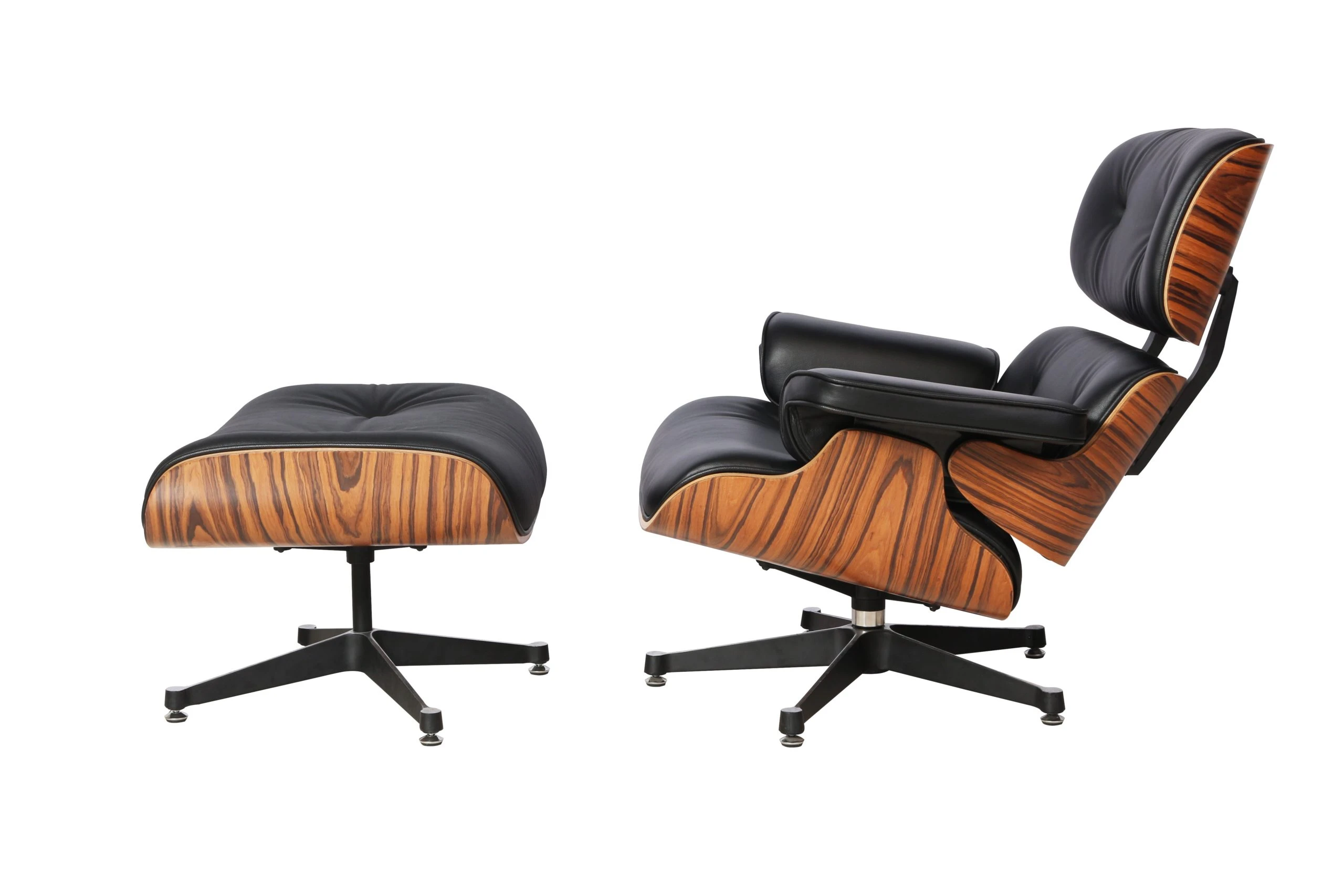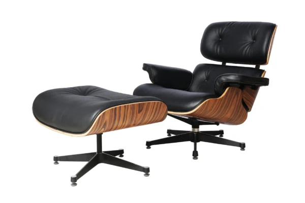 The Eames Lounge Chair achieves its legendary comfort through sculptural form and thoughtful engineering. The seat, backrest, and armrests are formed from seven-layer laminated rosewood veneer, molded under heat and pressure to create the chair’s organic, flowing curves. These plywood shells connect via rubber and metal shock mounts—an innovative system that allows subtle flex and movement, creating what the Eameses described as a “resilient” sitting experience that responds naturally to the body.