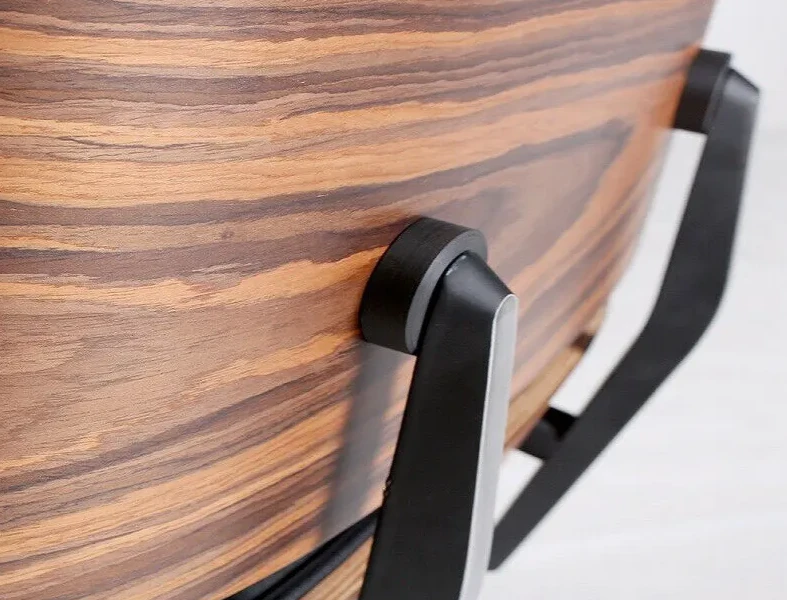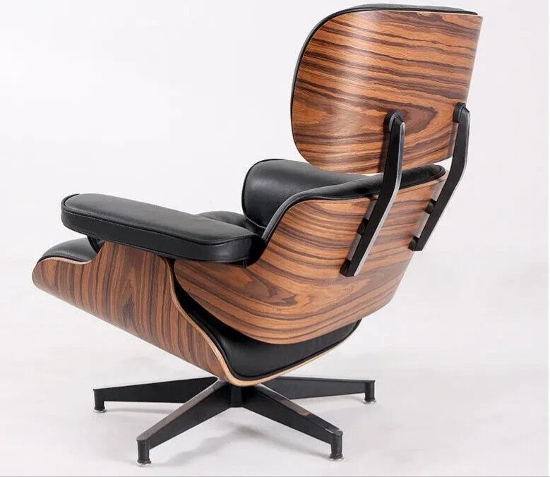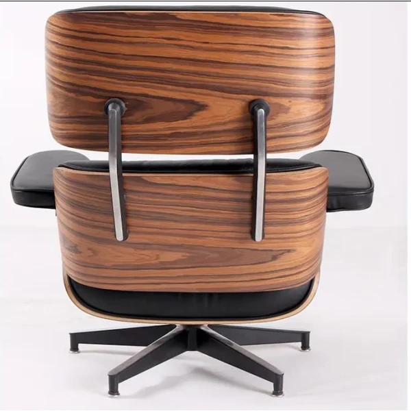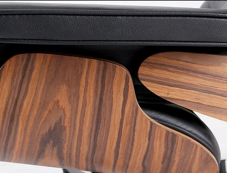 The Eames Lounge Chair’s comfort is rooted in its engineering. The seat, backrest, and armrests are formed from seven-layer laminated light rosewood veneer, carefully shaped and heat-pressed to achieve the chair’s organic curves. These plywood shells connect via rubber shock mounts—a system that allows subtle movement and flex, creating what the Eameses called a “resilient” seating experience. The result is a chair that responds to the body, encouraging relaxation without rigidity.