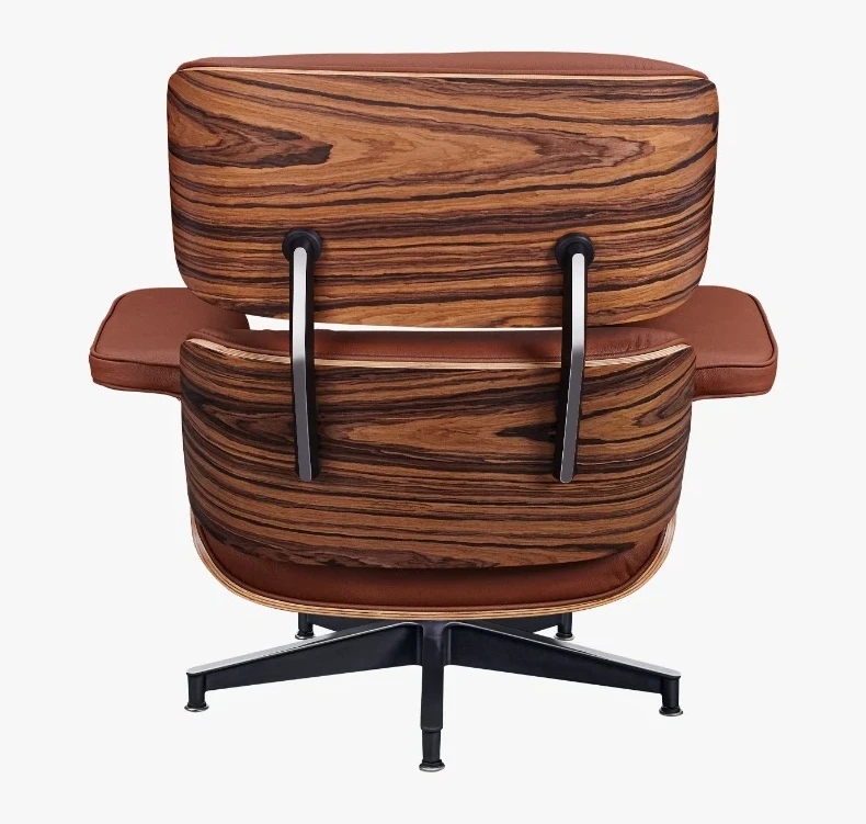 The Eames Lounge Chair’s comfort is rooted in its engineering. The seat, backrest, and armrests are formed from seven-layer laminated rosewood veneer, carefully shaped and heat-pressed to achieve the chair’s organic curves. These plywood shells connect via rubber shock mounts—a system that allows subtle movement and flex, creating what the Eameses called a “resilient” seating experience. The result is a chair that responds to the body, encouraging relaxation without rigidity.
