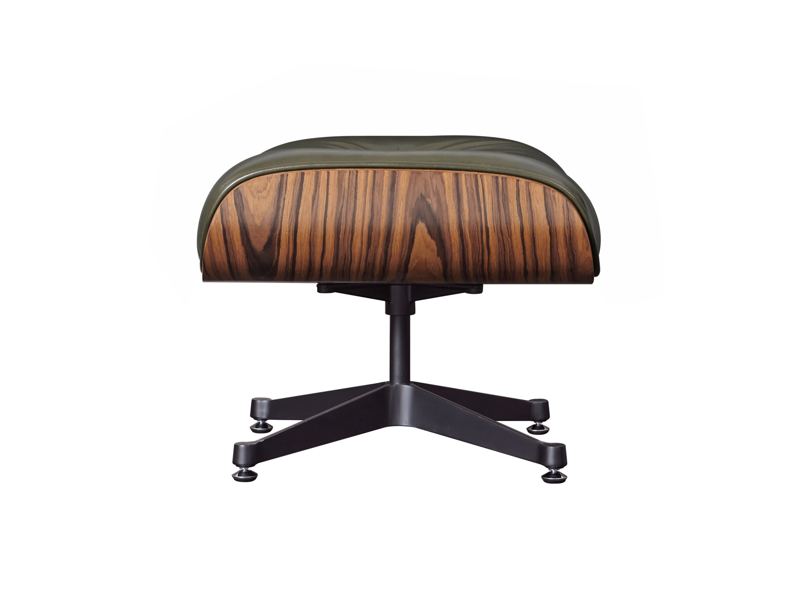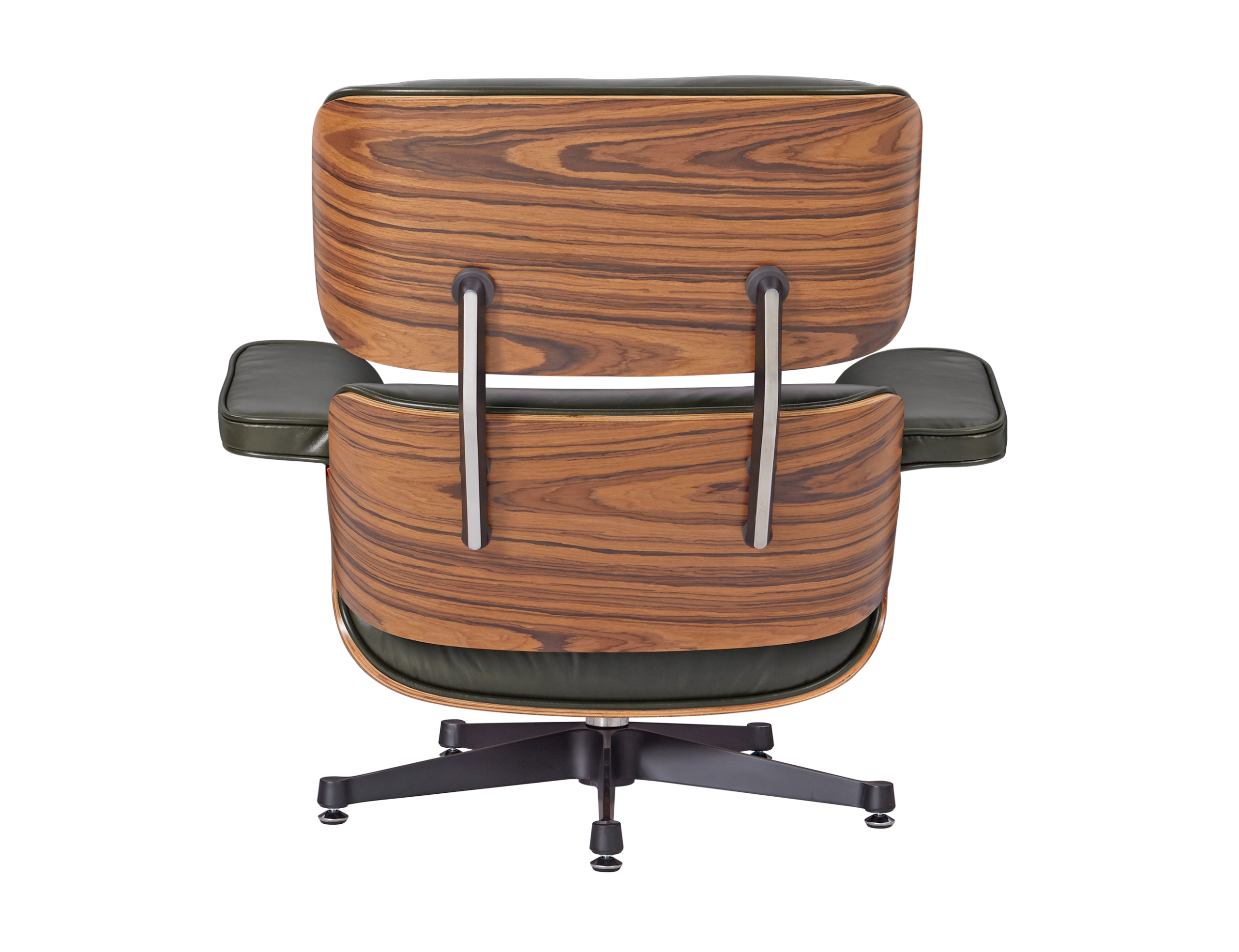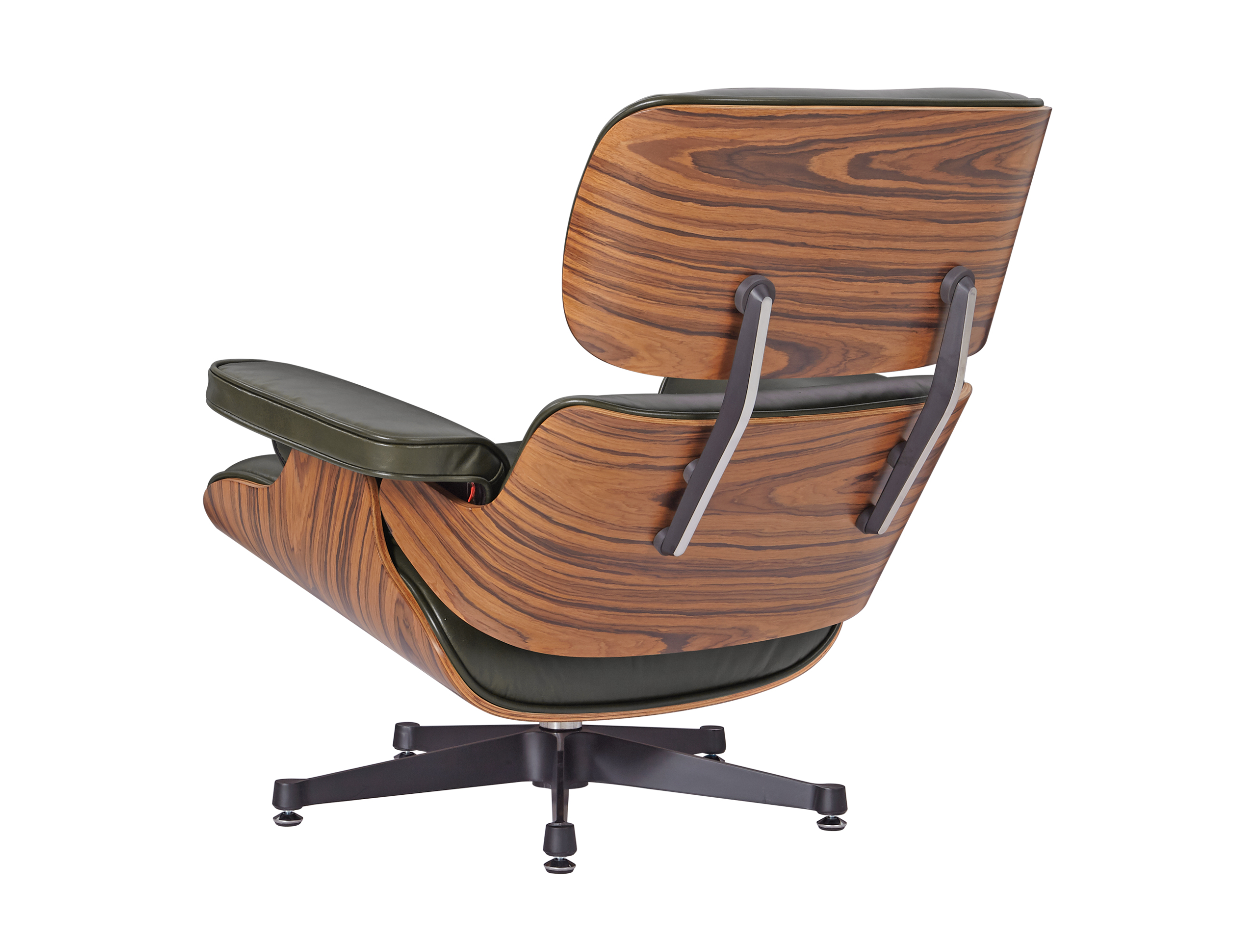 Each of the three cushions is hand-sewn with welted piping and filled with high-density fire-retardant foam, then upholstered in premium waxy dark green Italian aniline leather. The rosewood veneer brings depth and drama with its darker tones and pronounced grain patterns, while the deep green leather adds sophistication and contemporary relevance. The five-star chrome aluminum base provides stability and 360-degree swivel functionality, while the ottoman’s four-star base completes the experience.