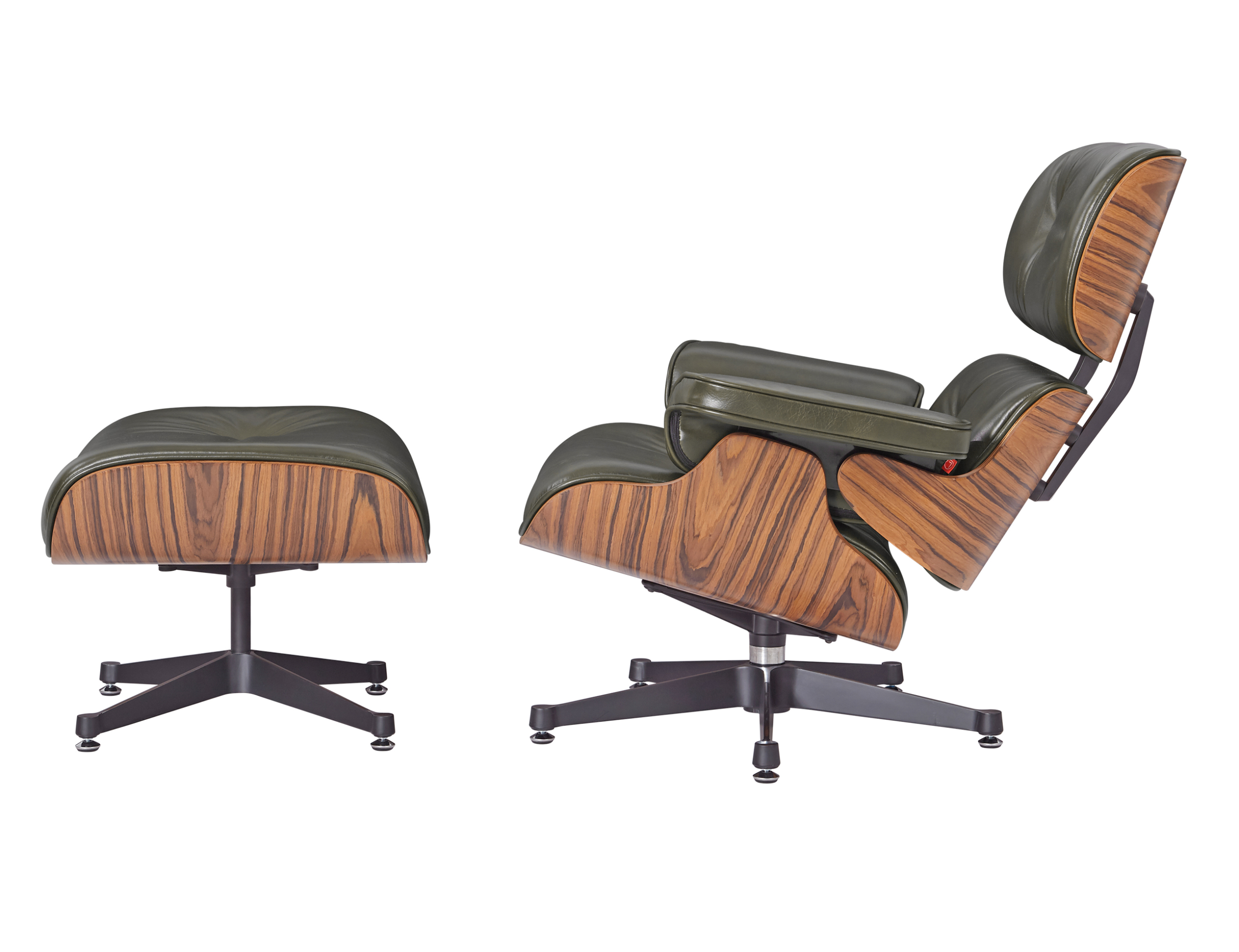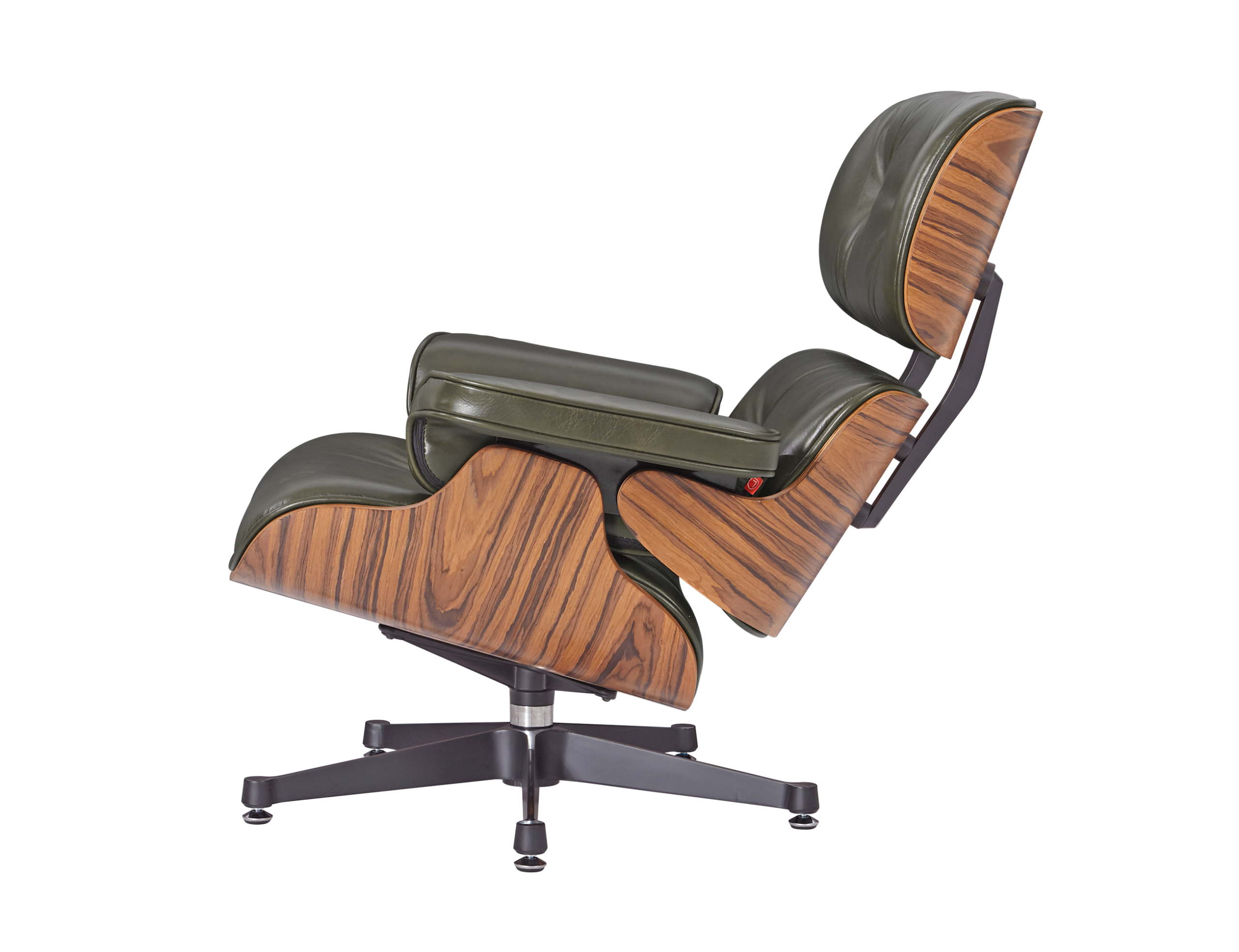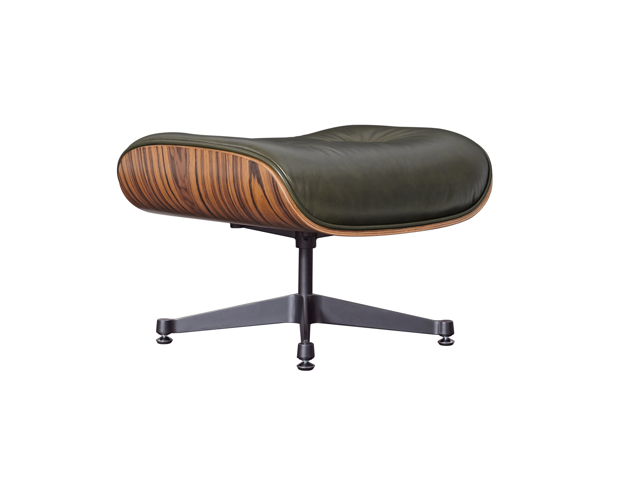 Each of the three cushions is hand-sewn with welted piping and filled with high-density fire-retardant foam, then upholstered in premium waxy dark green Italian aniline leather. The rosewood veneer brings depth and drama with its darker tones and pronounced grain patterns, while the deep green leather adds sophistication and contemporary relevance. The five-star chrome aluminum base provides stability and 360-degree swivel functionality, while the ottoman’s four-star base completes the experience.