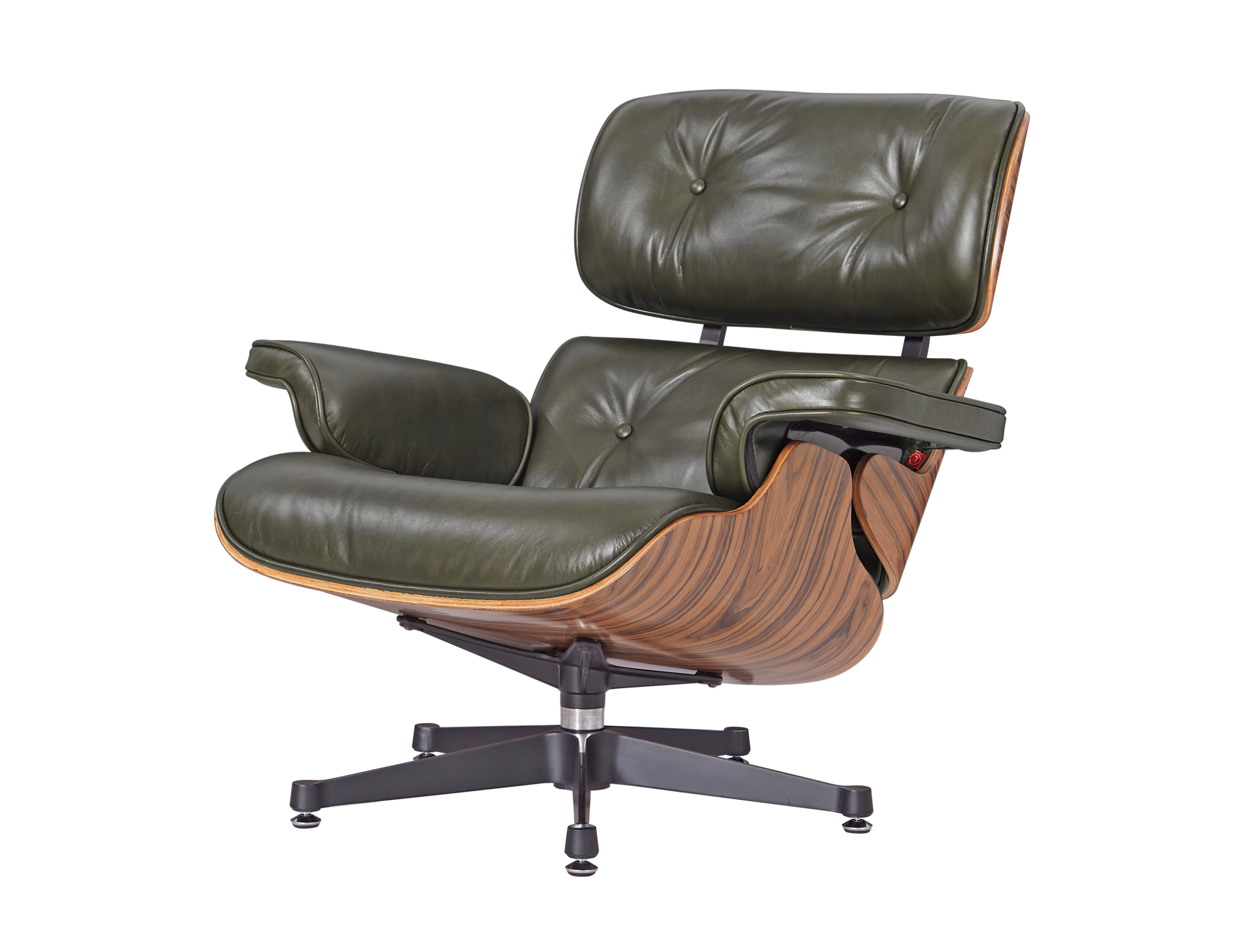 The waxy dark green polished finish represents a distinctive choice for the Eames Lounge Chair. This full-grain Italian aniline leather undergoes minimal processing to retain the hide’s natural texture and character. The waxy finish creates a subtle luster that deepens with age, while the rich green tone adds sophistication without abandoning the chair’s mid-century heritage. Paired with rosewood’s darker grain and reddish undertones, the combination creates a refined, contemporary statement.